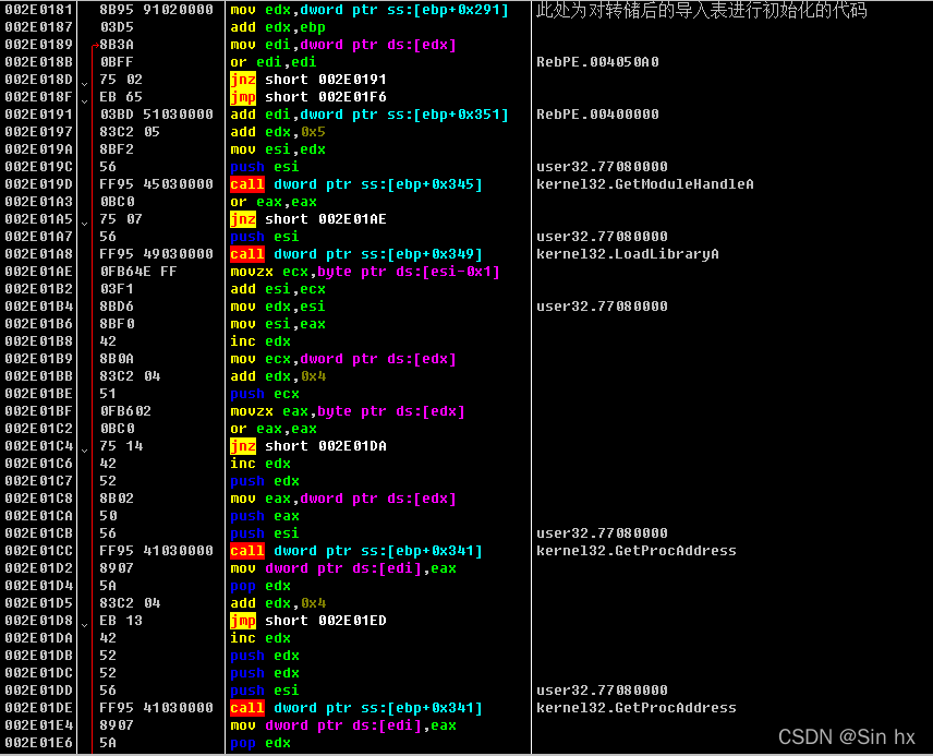 每一次循环执行到0x2e01de处的GetProcAddress函数时,都可以看到加壳程序在获取不同API函数的地址,以此来填充IAT。