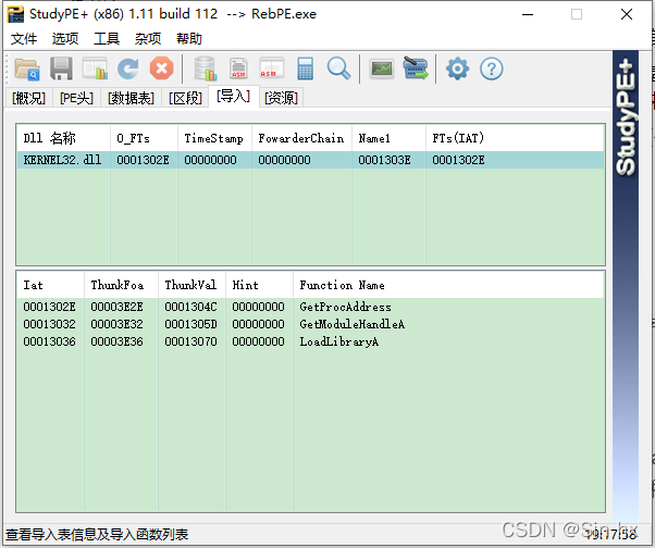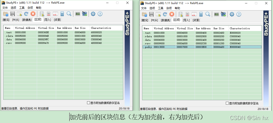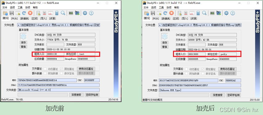 同样使用书中的例子RebPE.exe,首先利用StudyPE对比程序加壳前后的区别: