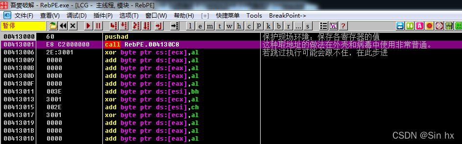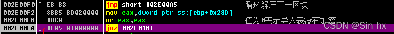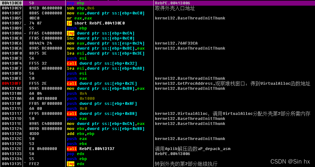 跟进0x413135处的jmp指令进入外壳的第2部分,外壳第2部分的主要工作是还原各区块数据,初始化原程序: