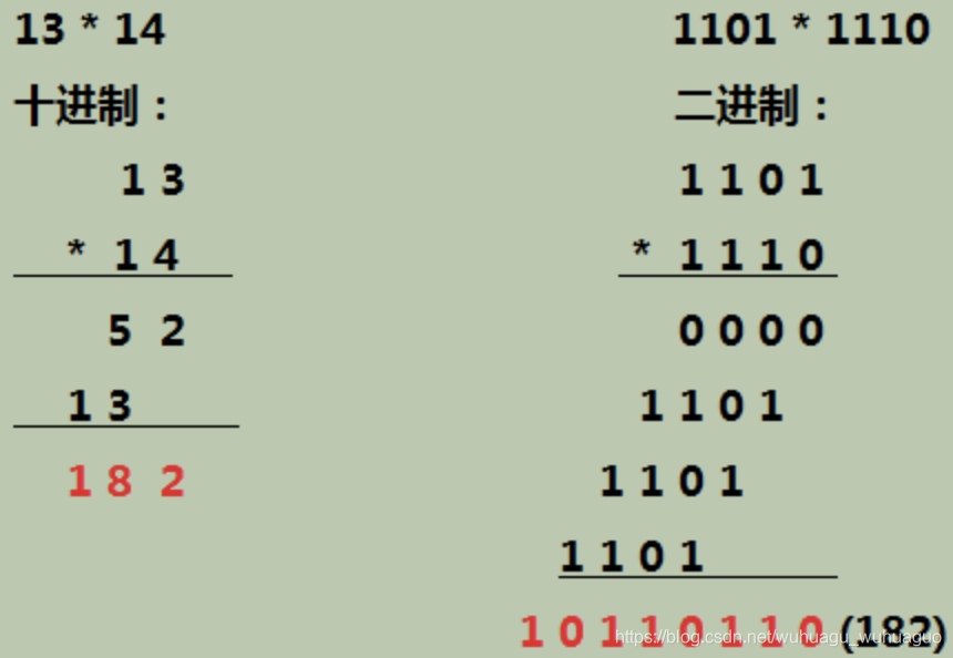 }![]() | 1、1110&1,最后1位=0,所以结果=0;被乘数1101左移1位=11010,乘数1110右移1位=0111; 2、0111&1,最后1位=1,所以结果=11010;被乘数11010左移1位=110100,乘数0111右移1位=0011; 3、0011&1,最后1位=1,所以结果=11010+110100=1001110;被乘数110100左移1位=1101000,乘数0011右移1位=0001; 4、0001&1,最后1位=1,所以结果=1001110+1101000=10110110;被乘数110100左移1位=11010000,乘数0011右移1位=0 乘数=0,循环结束。 | (1) 判断乘数是否为0,为0跳转至步骤(4) (2) 将乘数与1作与运算,确定末尾位为1还是为0,如果为1,则相加数为当前被乘数;如果为0,则相加数为0;将相加数加到最终结果中; (3) 被乘数左移一位,乘数右移一位;回到步骤(1) (4) 确定符号位,输出结果; |