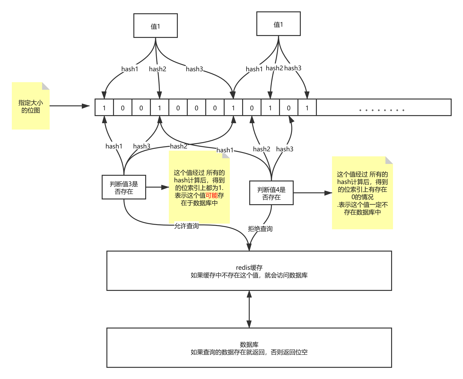 - 如果布隆过滤器返回值为1,就可以访问redis缓存,如果缓存中不存在这个值,就会访问数据库查询。有可能这个数据不存在数据库中,返回为空。