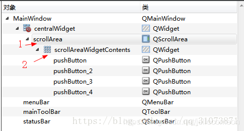 可以发现,4个button并不是直接位于QScrollArea中的,而是位于它的成员scorllAreaWidgetContents中的,这个成员的类型也是控件类型QWidget,也就是说,QScrollArea这个容器本身就套了两层,我们放入的按钮等控件,都处在scrllAreaWidgetContents层,下文中我把QScrollArea.widget统一称之为“内部容器”或者"内容层",内部容器是QScrollArea这个控件的子控件。