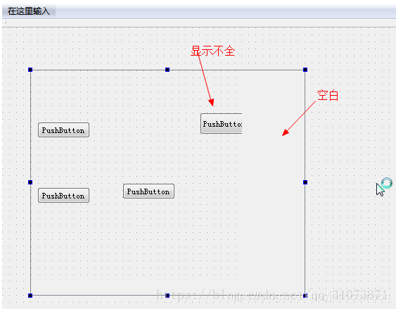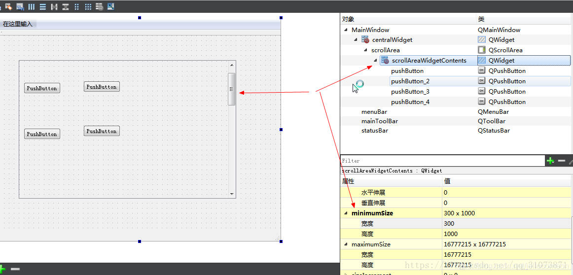 我们拖入一个QScrollArea,再向他里面拖入4个button,观察信息如下: