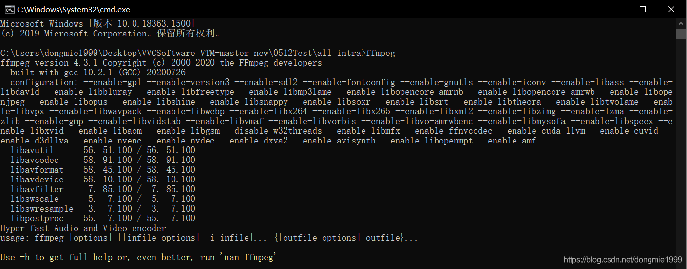 3、打开cmd 输入ffmpeg,显示如下即为安装成功