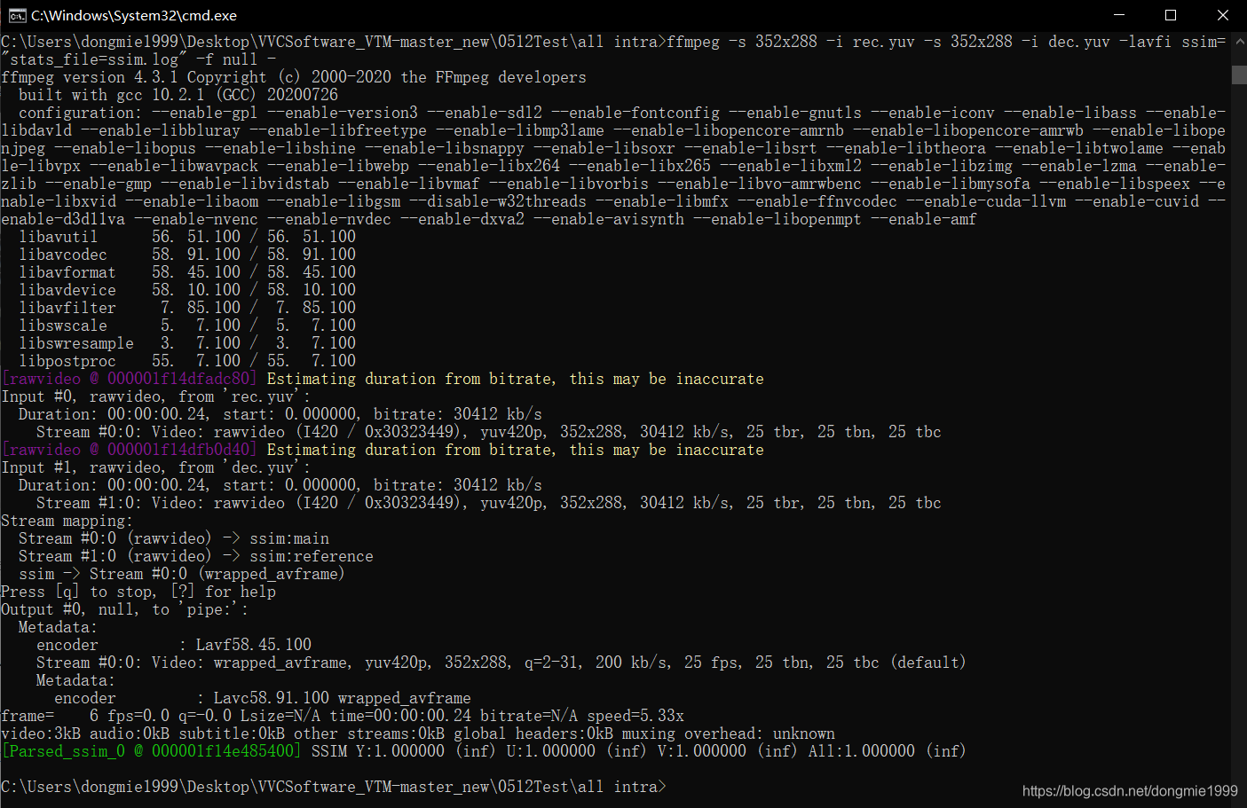 同样是计算当前目录下两个视频的 SSIM,命令如下,其中 352x288 是视频的 宽x高,两个文件的分辨率要一致