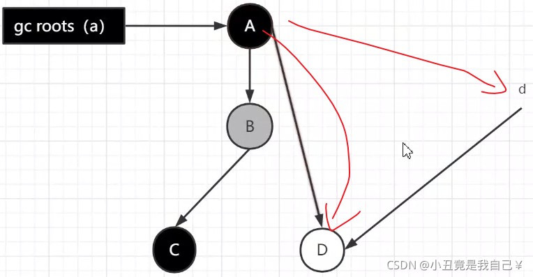 当对象B的成员变量的引用发生变化时,比如引用消失(a.b.d = null),我们可以利用写屏障,将B 原来成员变量的引用 对象D记录下来: