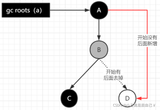 人话版: 原始快照不会管新增的引用,它关心的是删除的引用,它会在集合里放一个指向D(对象)的引用,重新标记是,集合内所有引用全部标记为黑色。