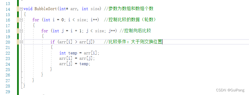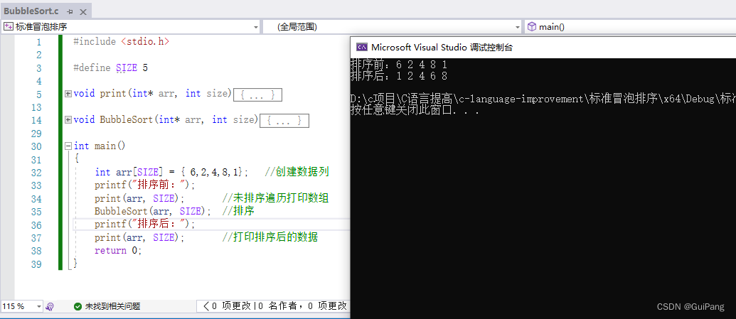 原理:对一列数据从头向尾,依次比较两个元素的大(小),按照排序规则(顺序/逆序),取出最大(小)的数据,交换两个数据,重复向后进行比较,直至所有元素比较完成,这样原始的一组杂乱的数据就能被按相应的规则排序成一组新的有序的数据。