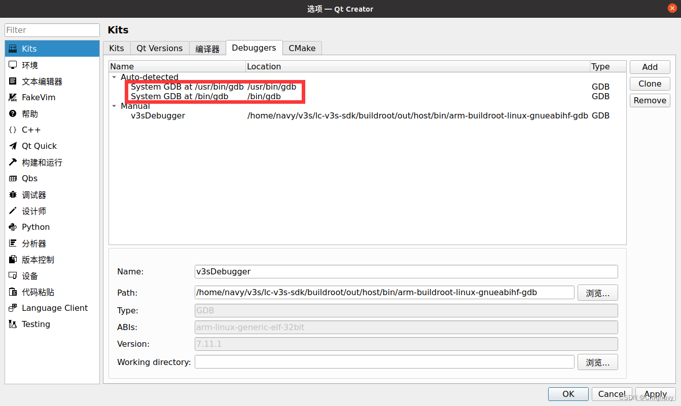 4)kits--> Debuggers ---> Manual 添加 ubuntu20.10 平台的GDB (正常安装好Qt ,打开kits 会自动检测到,由于我的环境已经自动检测到,所以没有手动添加):