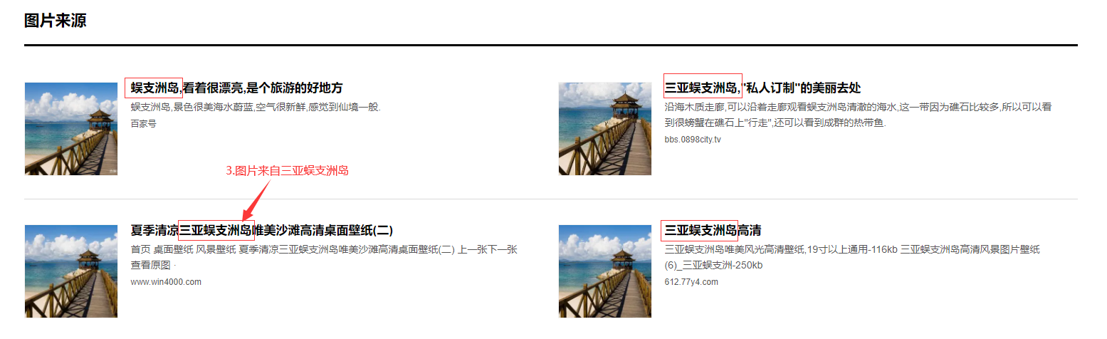 根据搜图的结果可以发现, 图片的来源均指向同一个地方: 三亚蜈支洲岛