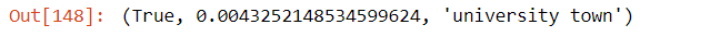 Return the tuple (different, p, better) where different=True if the t-test is True at a p<0.01 (we reject the null hypothesis), or different=False if otherwise (we cannot reject the null hypothesis). The variable p should be equal to the exact p value returned from scipy.stats.ttest_ind(). The value for better should be either "university town" or "non-university town" depending on which has a lower mean price ratio (which is equivilent to a reduced market loss).'''