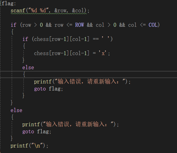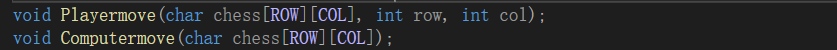 } 在这里我分成了玩家移动以及电脑移动,在设计时你要知道你面向的不是程序员玩这个游戏而是玩家,所以他们不知道是从0,1,2,3排列的,所以你就需要在他们输入的棋子坐标上减一,来进行下一步操作,而且我们下棋子要在‘ ’处下,而不能下重复,或者越界,所以我是这么处理的