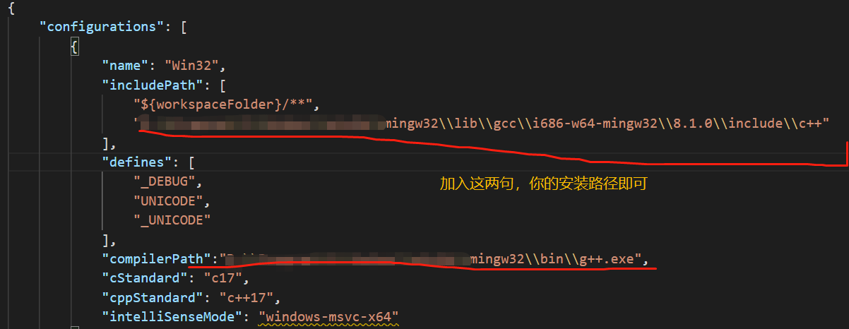 3 注意,编写的(c/c++)文件,最好是放在某个文件夹下,然后在VsCode中打开文件夹后,找到 .vscode 文件夹中的 c_cpp_properties.json 打开,配置该文件中内容