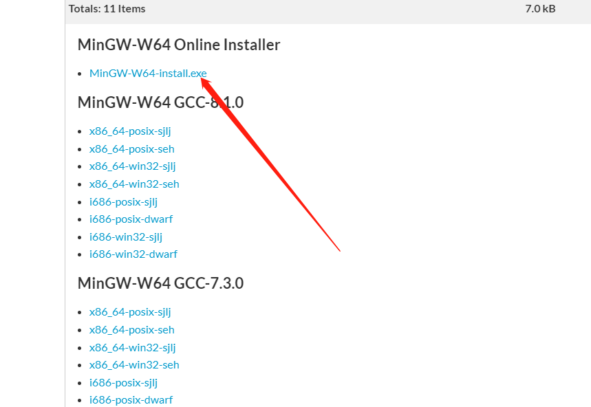 1 安装 MinGW,下载链接:MinGW-w64 - for 32 and 64 bit Windows - Browse Files at SourceForge.net ,下拉点击 install.exe 进行下载安装