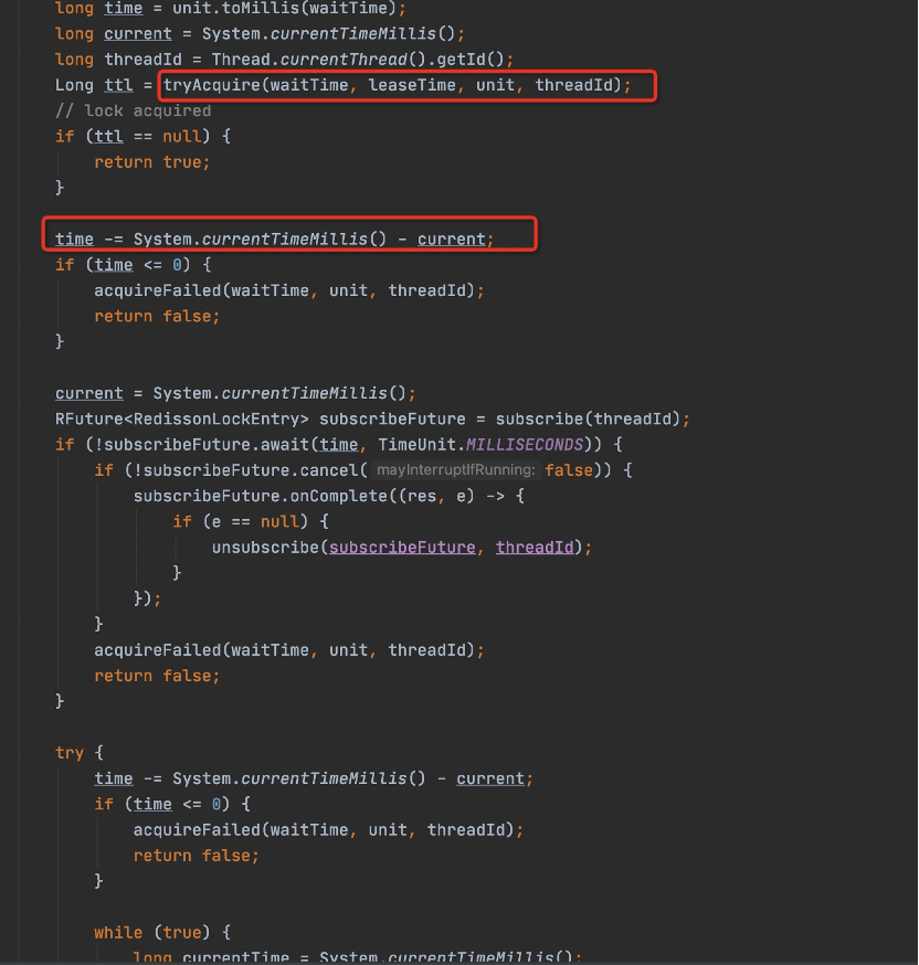从源码我们可以看到,主要逻辑就是获取锁,判断其他线程是否获取锁,若获取了就重复尝试获取,然后期间有若干超时判断: