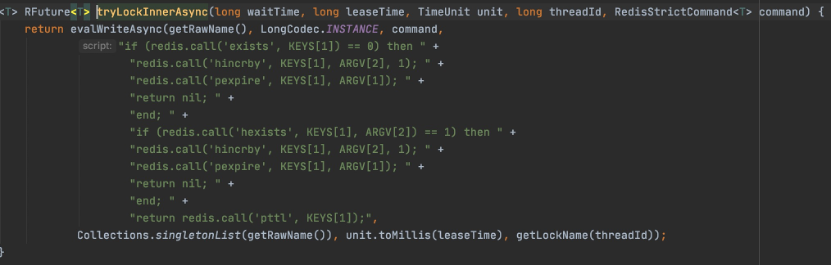 tryAcquire方法干嘛的呢? 上图就是在此方法里的代码,该方法里面主要和redis通信,用lua封装复杂的业务逻辑发给redis,若key没有上锁,则返回null,上锁了,则返回超时时间。