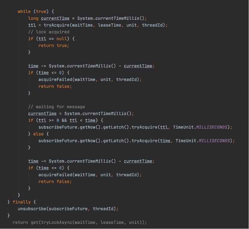 waitTime和redis锁住的key的超时时间大小做比较,取二者中比较小的值,用java的Semaphore信号量tryAcquire方法来阻塞线程,Semaphore是由上面的代码subscribe方法控制的。