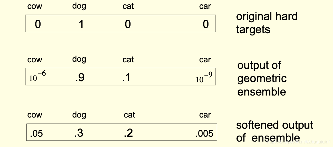在网络的 softmax 函数中提高温度 T 的效果示例。由此产生的概率与我们所知道的真实情况一致,即狗比牛更像猫,当然比汽车更像。源自