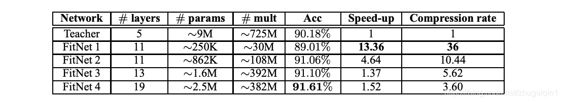 在 Hinton 等人的这一初步突破之后。为了训练学生模仿教师的 softmax 输出,研究人员 Romero 等人。发现学生还可以使用来自教师中间隐藏层的信息来提高其最终表现。具体来说,他们提出了他们所谓的“FitNets”,这是一种比老师更薄但更深的学生网络,它们增加的深度使它们能够很好地泛化,而它们的小宽度仍然使它们紧凑。罗梅罗等人。在学生网络中间引入一个“引导层”,其任务是从教师网络中间的一个“提示”层中学习。下表展示了与 CIFAR-10 图像分类数据集上的教师架构相比,不同大小的 FitNet 实现的加速、减少的参数数量和普遍提高的准确性。此外,它们的性能与最先进的方法不相上下,其中当时的最高准确率为 91.78%