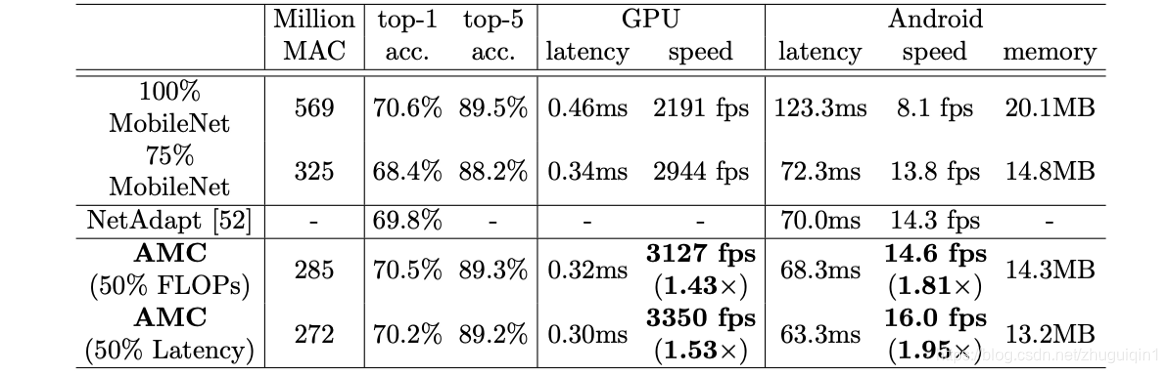AMC 的基于学习的剪枝在各种模型上针对手工制作的、基于规则的方法进行了测试,并被发现表现出全面的卓越性能。例如,下表显示了 AMC 在 MobileNet 上使用 50% FLOP 或 50% 延迟约束的压缩结果,与基于规则的策略相比,将网络修剪为原始参数的 75%(第二行):