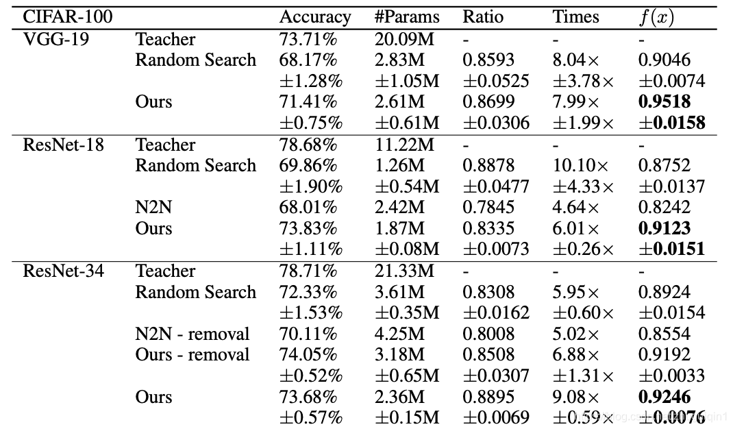 最近在 2019 年,Cao 等人。使用贝叶斯优化来搜索最佳压缩架构。在他们的实现中,他们不断地添加到一组模型中,这些模型都基于原始网络,但通过随机删除或收缩层并添加跳过连接进行了压缩。这些架构是根据与原始架构相比减少的参数数量和准确度来评估的。在多个 epoch 中,对模型进行采样并用于学习预测新的随机生成的压缩模型在压缩和准确性方面将在多大程度上优于该集合的当前最佳模型——这样,随机生成的架构不会不必经历对数据进行实际评估的时间密集型过程,而是可以探索更多架构。基于这些预测,新生成的模型中最有希望的将根据数据进行评估,并将其添加到不断增长的模型集中,然后该过程继续进行。最后,在压缩和精度方面选择集合中最好的模型。下表展示了与随机 NAS 方法和 Ashok 等人相比,Cao 等人的方法在 CIFAR-100 数据集上压缩三种结构以进行图像分类的有效性。 al 最先进的“N2N”技术。