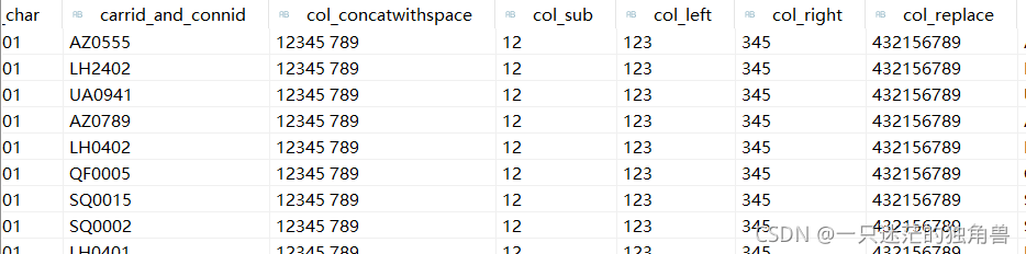 concat_with_space('12345', '789', 1) as col_concatwithspace, // 第三个参数是空格数
