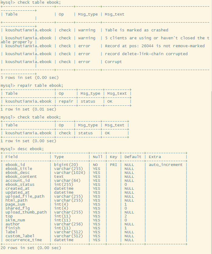 最近线上运行的项目突然数据库出错,某一张表不知道什么原因已经崩溃,提示需要去修复,经过各种修复方法,最终实现