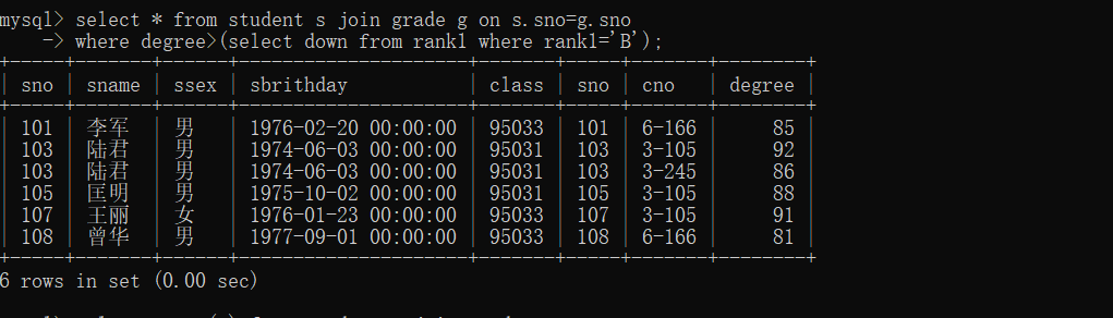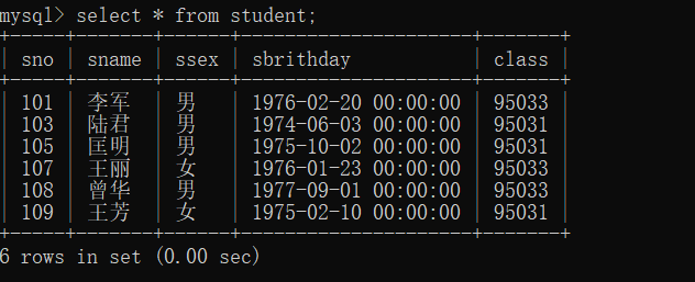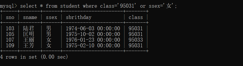 6、查询student表中“95031”班或性别为“女”的同学记录