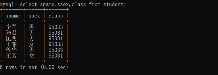 1、查询student表中的所有记录的sname、ssex、class列