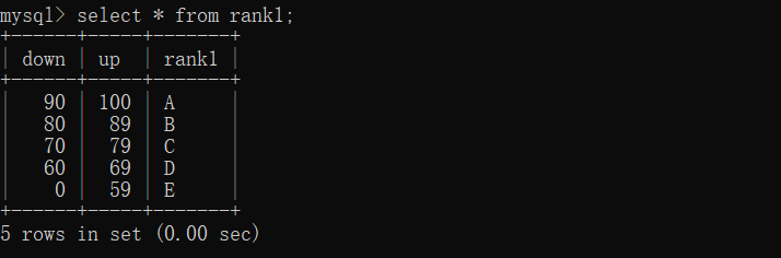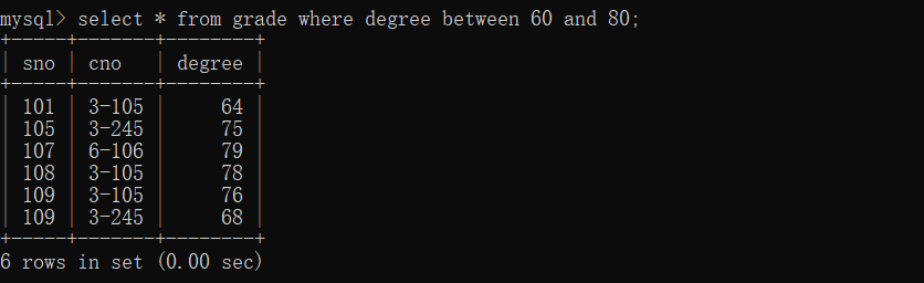 5、查询grade表中成绩在60-80之间的所有记录