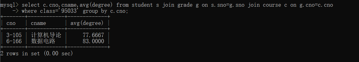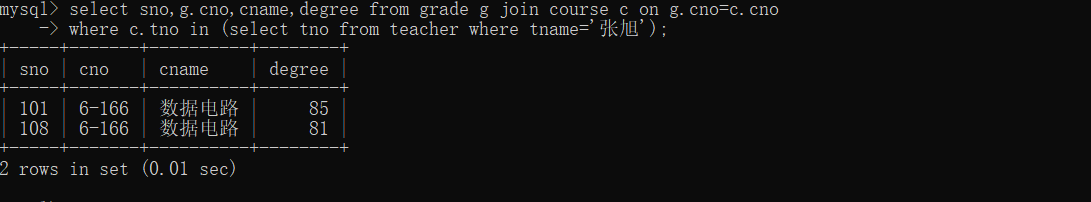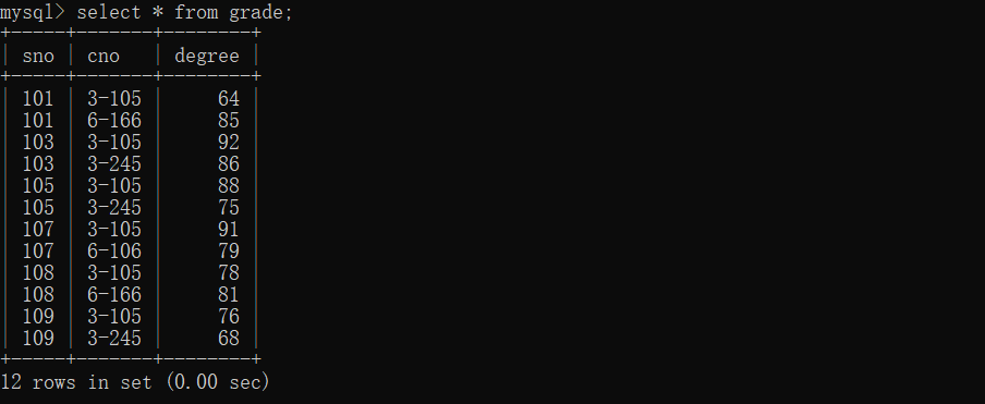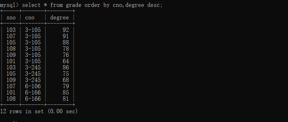 8、以cno升序、degree降序查询grade表的所有记录
