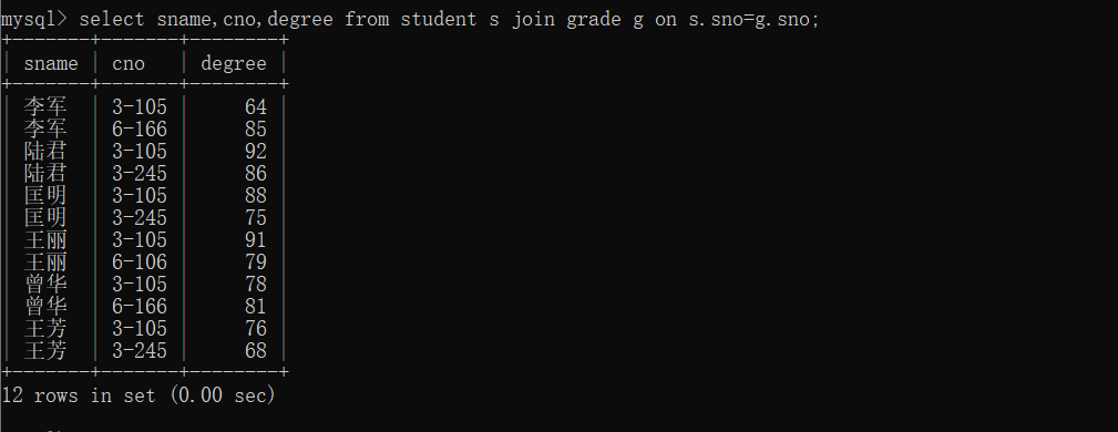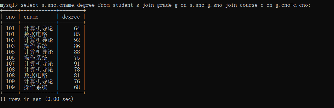 14、查询所有学生的sname、cno、degree列