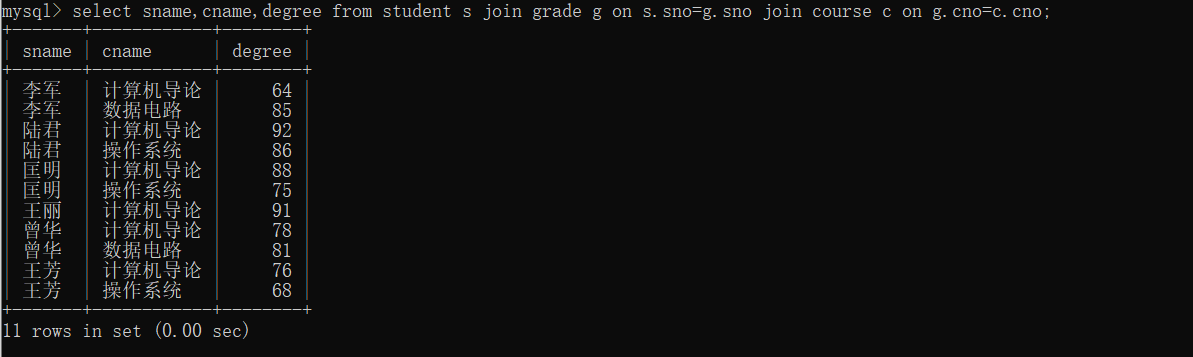 16、查询所有学生的sname、cname、degree列