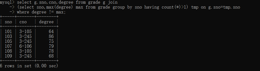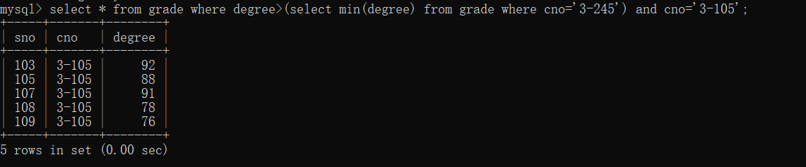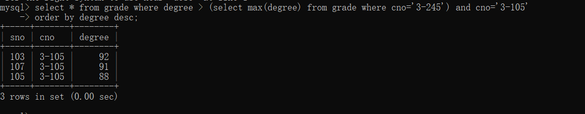 30、查询选修编号为“3-105”且成绩高于选修编号为“3-245”课程的同学的Cno、Sno和Degree.