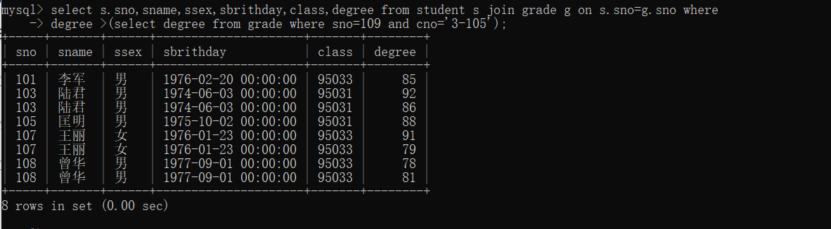 19、查询选修“3-105”课程的成绩高于“109”号同学成绩的所有同学的记录。