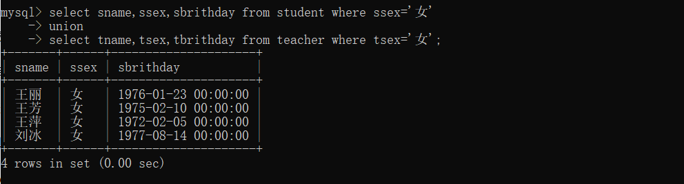 32、查询所有“女”教师和“女”同学的name、sex和birthday.