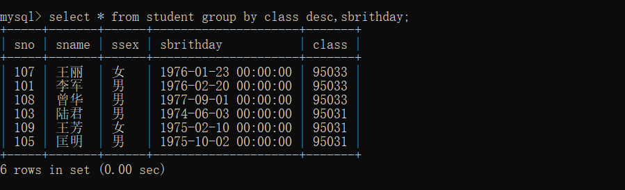 7、以class降序查询student表的所有记录