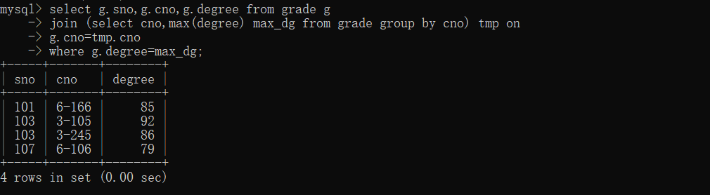 42、查询最高分同学的Sno、Cno和Degree列。