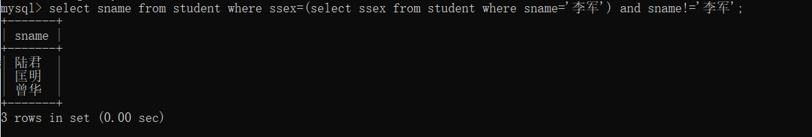 43、查询和“李军”同性别的所有同学的Sname.