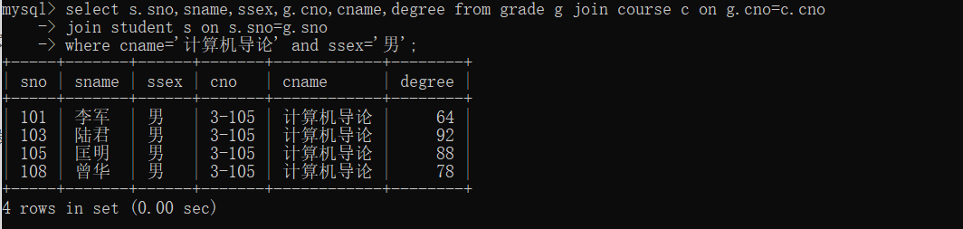 45、查询所有选修“计算机导论”课程的“男”同学的成绩表