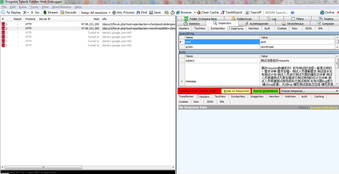 点击发布帖子,此时请求被fiddler拦截掉,将右侧requests body里面的字段message内容前新增内容:“篡改requests数据成功!”,然后点击Run to Completion,先关闭掉拦截Rules---->Automatic Breakpoints---->Disabled,其他请求都放过,点击工具栏中的“Go”