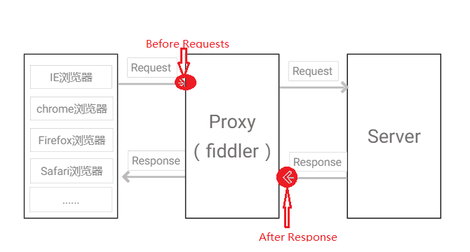 前面讲过fiddler作为代理服务器时的请求流程图,请求时,可被篡改的两个点:Before Requests、After Responses。