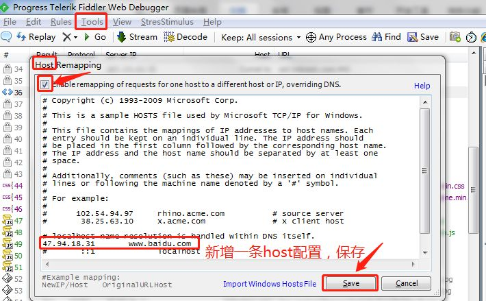 作为前端工程师现在使用绑定hosts在本地开发调试的场景也越来越多,另外,当预发环境和生产环境共用同一个域名时,通过绑定hosts的方式将访问的域名原本指向生产服务器,强制指向预发服务器上。举个例子,假如我要将www.baidu.com指向87testing.com对应的服务器上,87testing.com对应的服务器公网ip:47.94.18.31,配置如下:Tools---->Hosts---->勾选Enable remapping of requests for one host to a different host or IP,overriding DNS.然后host编辑区域,输入需要域名需要指向的服务器公网IP,比如我将www.baidu.com域名指向了47.94.18.31,保存即可。(如果不使用host,勾去掉即可)
