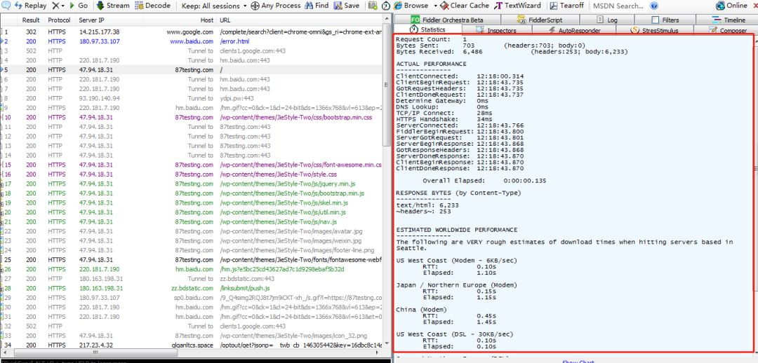 页面请求时间的统计,比较详细,如果要看整个页面从请求,到最后一个请求结束的整体时间,也可以在会话列表中,ctrl+点击需要统计的请求,右边Statistics可以看到总体明细。