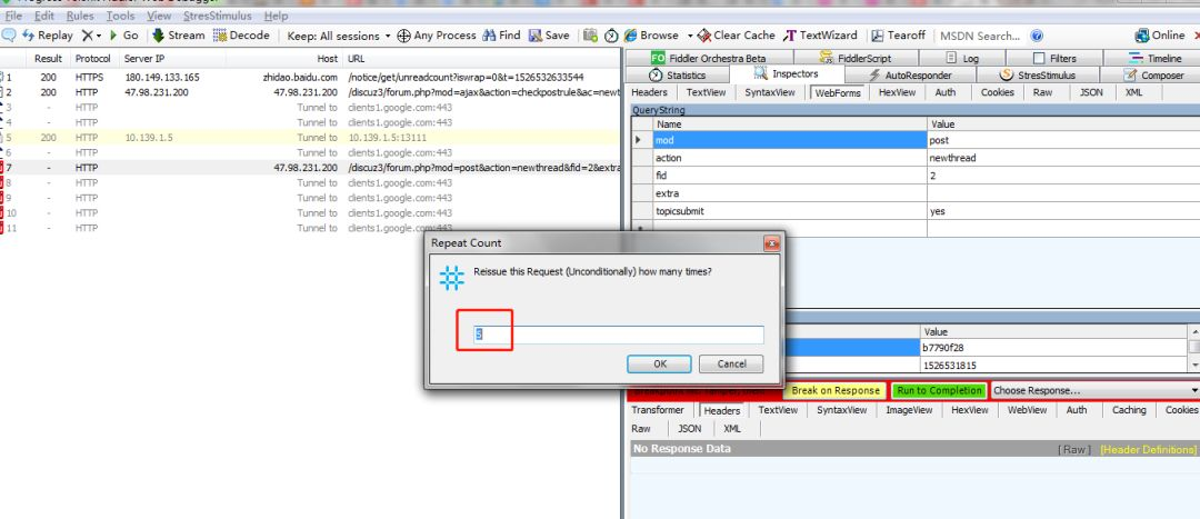 一个人一天只能有一次抽奖机会,那么在点击抽奖按钮发出请求之前,要设置Before Requests Breakpoints,点击抽奖后在会话列表中会看到一个被断点的请求,此时鼠标选中此请求,按shift+u,会弹出并发次数的设置,如下,设置并发次数5次(下面演示截图是发布帖子并发时的截图,可参考)