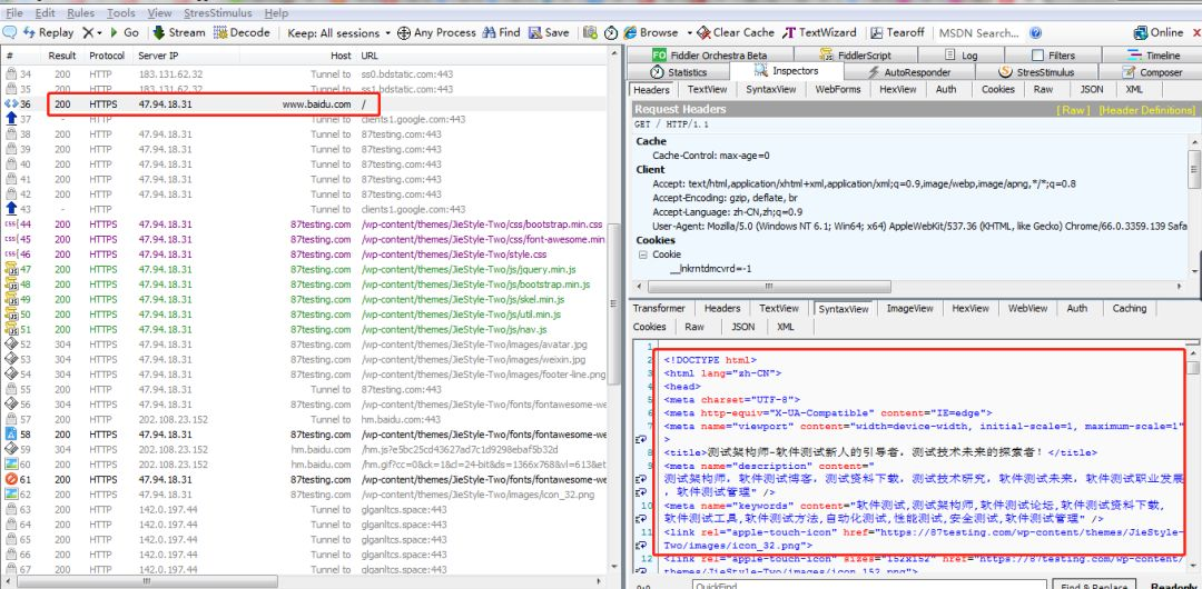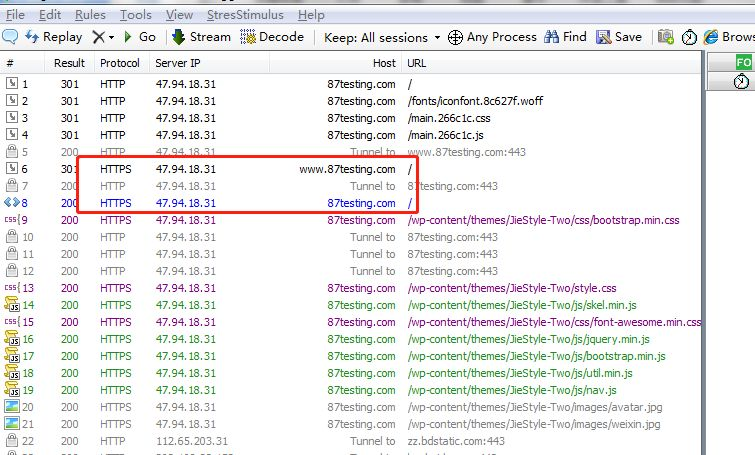此时,证书还不算完成安装完,假如手机是ios10.0以上系统,需要在手机系统设置---关于手机----证书信任设置,在此页面把证书开启即可,此时手机safari浏览器地址栏输入:87testing.com,进行访问,在电脑端fiddler上即可显示出对应的请求: