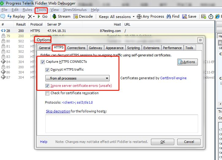 Tools--->Options--->HTTPS,勾选CaptureHTTPS CONNECTs、Decrypt HTTPS traffic 、ignore server certificate errors(unsafe),点击OK,会弹出证书直接确认即可。
