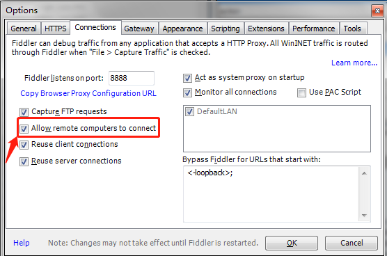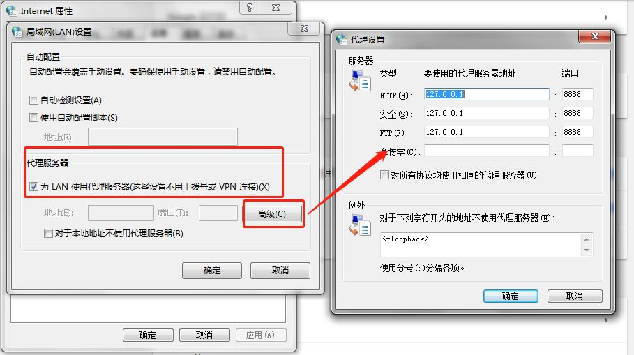 Fiddler工作于七层中的应用层,在client与webserver之间以代理服务器的形式存在,启动fiddler后会监听本地127.0.0.1的8888端口(默认端口),IE/Chrome浏览器会自动设置局域网代理(Firefox代理是独立的,需要单独设置),如图: