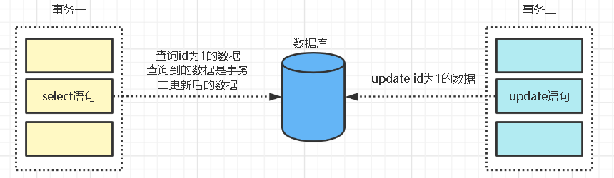 如下图,当事务二修改了id为1的数据后,事务一查询id为1的数据,查询的结果是修改后的数据,此时事务二可能会回滚事务,导致事务一查询的数据是一个脏数据,临时的数据。
