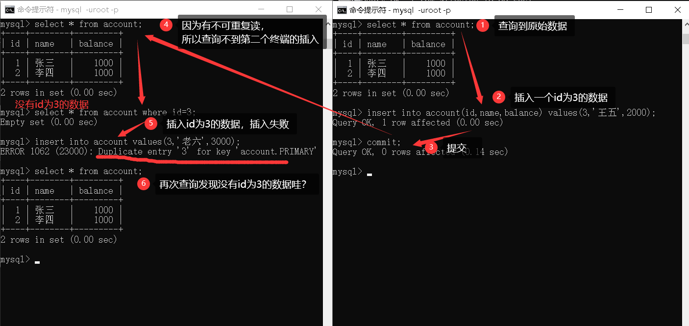 如下图,当事务一第一次查询到没有id为1的数据时,准备插入前,事务二恰好插入了id为1的数据,且提交了事务,因为id是主键所以事务一会插入失败,此时因为解决了不可重复读的问题,事务一再次查询id为1的数据,还是查不到,然后就是插不进去,导致幻读。侧重于插入记录。